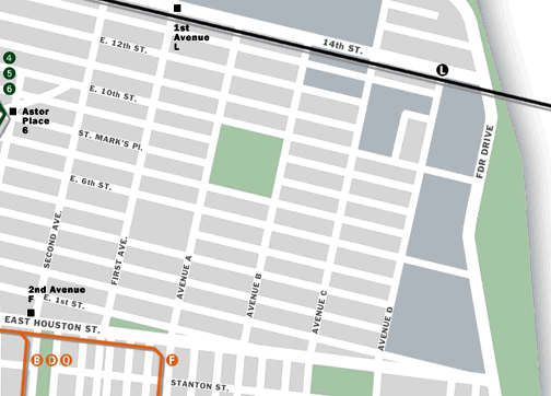 Public Theater, Starbucks at Astor Place, Barnes and Noble at Astor Place, Angelika Theater, McDonalds on First Ave and 2nd St.